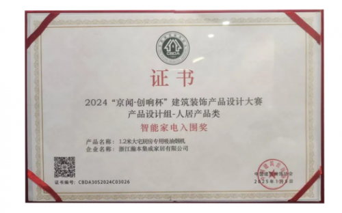 瀚本家居研发的1.2米大宅厨房专用吸油烟机获得2024京闻·创响杯建筑装饰产品设计大赛产品设计组-人居产品类智能家电入围奖。获奖此殊荣不仅标志着瀚本在创新技术领域的突破和先进性,更是其科研实力和品牌地位的见证,代表着业界权威对瀚本的认可肯定。
