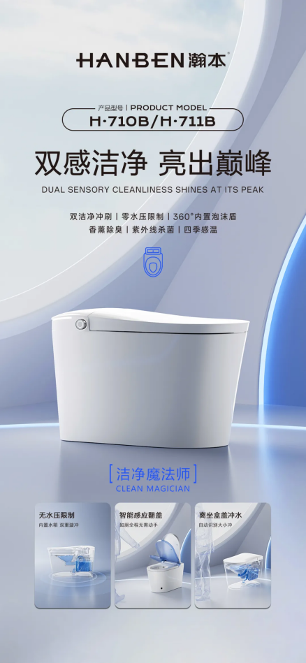 还在为马桶冲水不给力、清洁麻烦犯愁?是时候给卫生间来次智能升级了!瀚本全新H·710B/H·711B智能马桶,带着双感洁净黑科技强势登场,把“如厕仪式感”直接拉满!