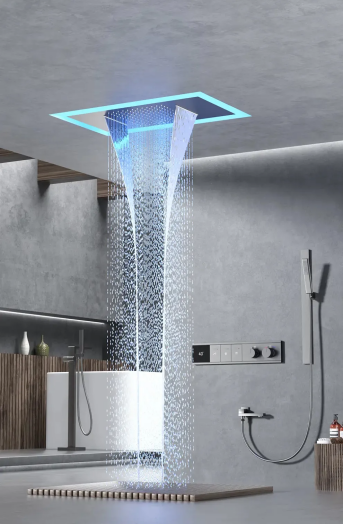 天幕顶喷雨淋双模式出水,尽享私人SPA。超乎想象的宽广水幕,其隐形设计将花洒主体巧妙嵌入天花板,摒弃墙面突兀装置,释放空间的同时,构建起无界视觉效果。当水流开启,顶喷如银河落瀑,搭配环绕蓝光,营造全身心沉浸式体验,让沐浴成为一场美学享受。
